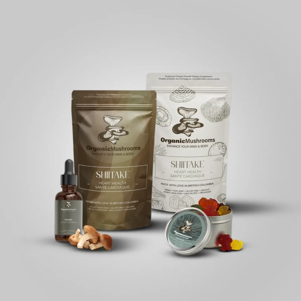 Our Shiitake supplements, available in powder, capsules, tinctures, and gummies, are crafted from organic, non-GMO, Canadian-grown Shiitake mushrooms, ensuring that you receive high-quality support for your physical well-being and vitality.