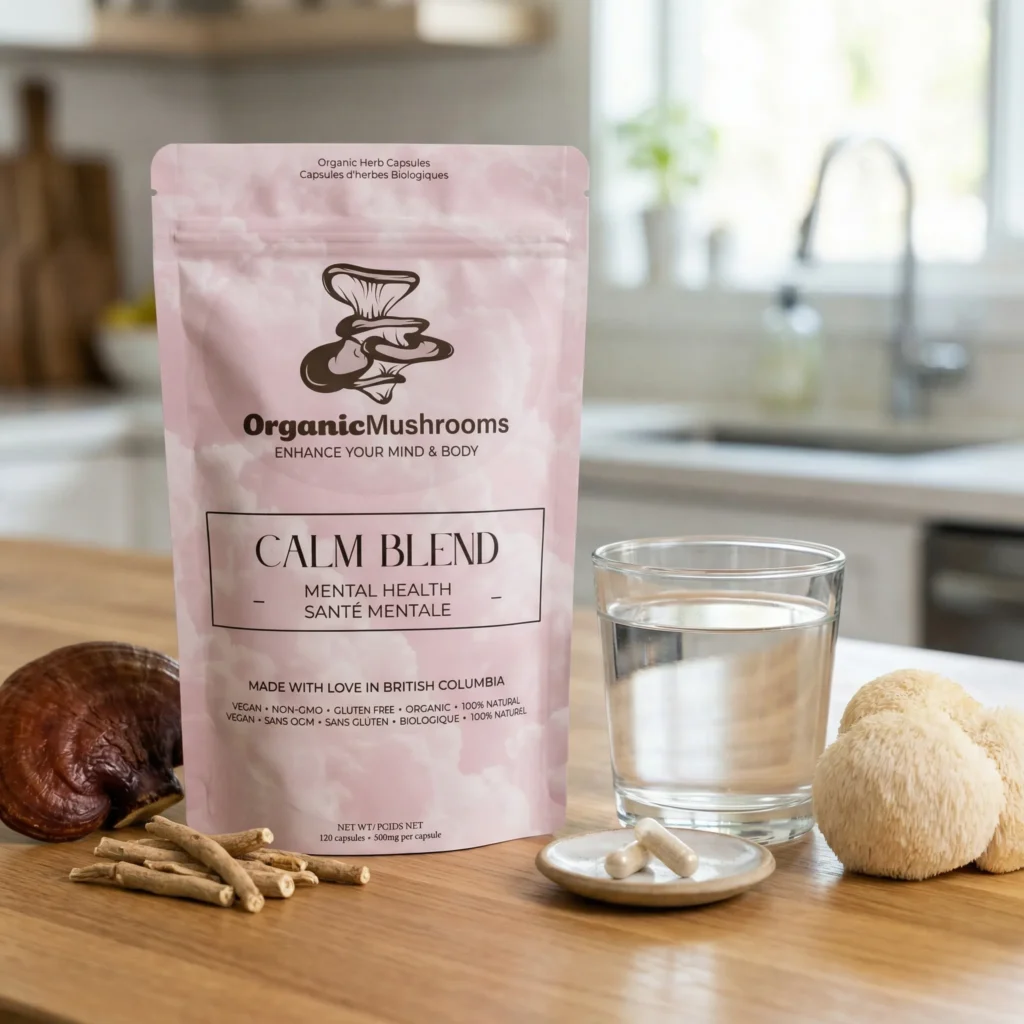 Our Calm Blend capsules are a premium and effective way to experience the calming, mood-balancing, and cognitive-supporting benefits of Ashwagandha, Reishi, and Lion’s Mane. Grown with care in Canada under strict quality control standards, our mushrooms are cultivated to ensure exceptional purity and potency. Each capsule delivers a powerful fusion of adaptogens and nootropics designed to support both mental clarity and emotional well-being.