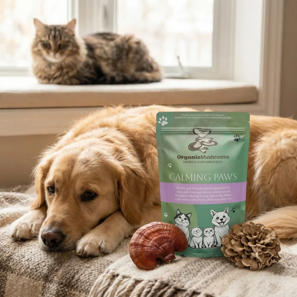 Calming Paws is a gentle, 100% organic mushroom blend designed to help your pet feel calm, balanced, and at ease. Featuring Reishi and Maitake mushrooms, this carefully crafted formula supports emotional well-being, reduces stress, and enhances your pet’s overall vitality. Each mushroom in this blend is selected for its calming and restorative benefits: