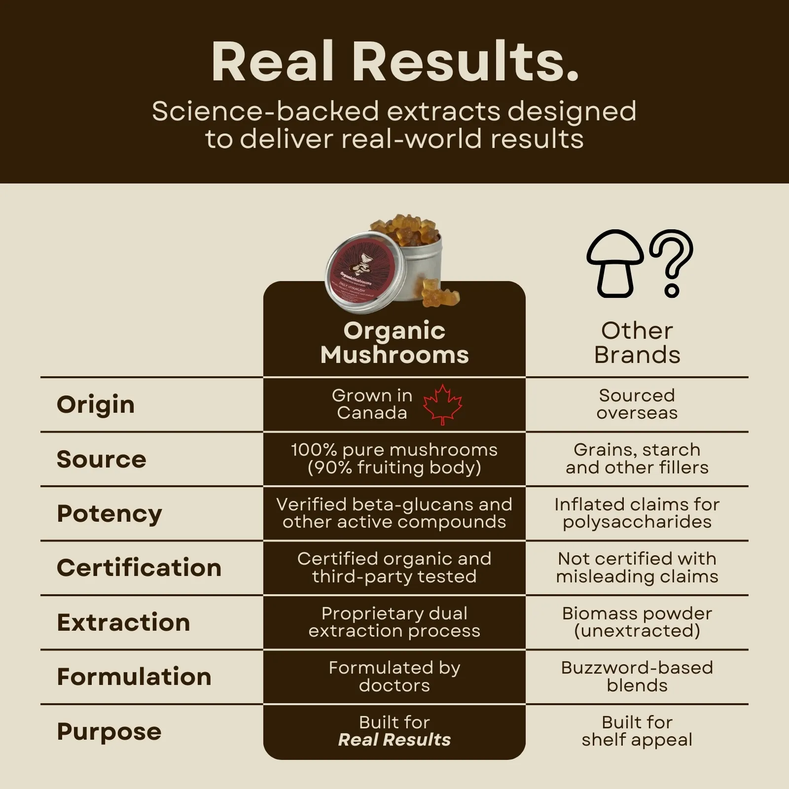 Our mushroom supplements are made (and grown) in Canada with organic mushrooms and no added fillers. Each batch is carefully extracted and third-party tested to guarantee the presence of the most beneficial compounds like beta-glucans and improve bioavailability.Â