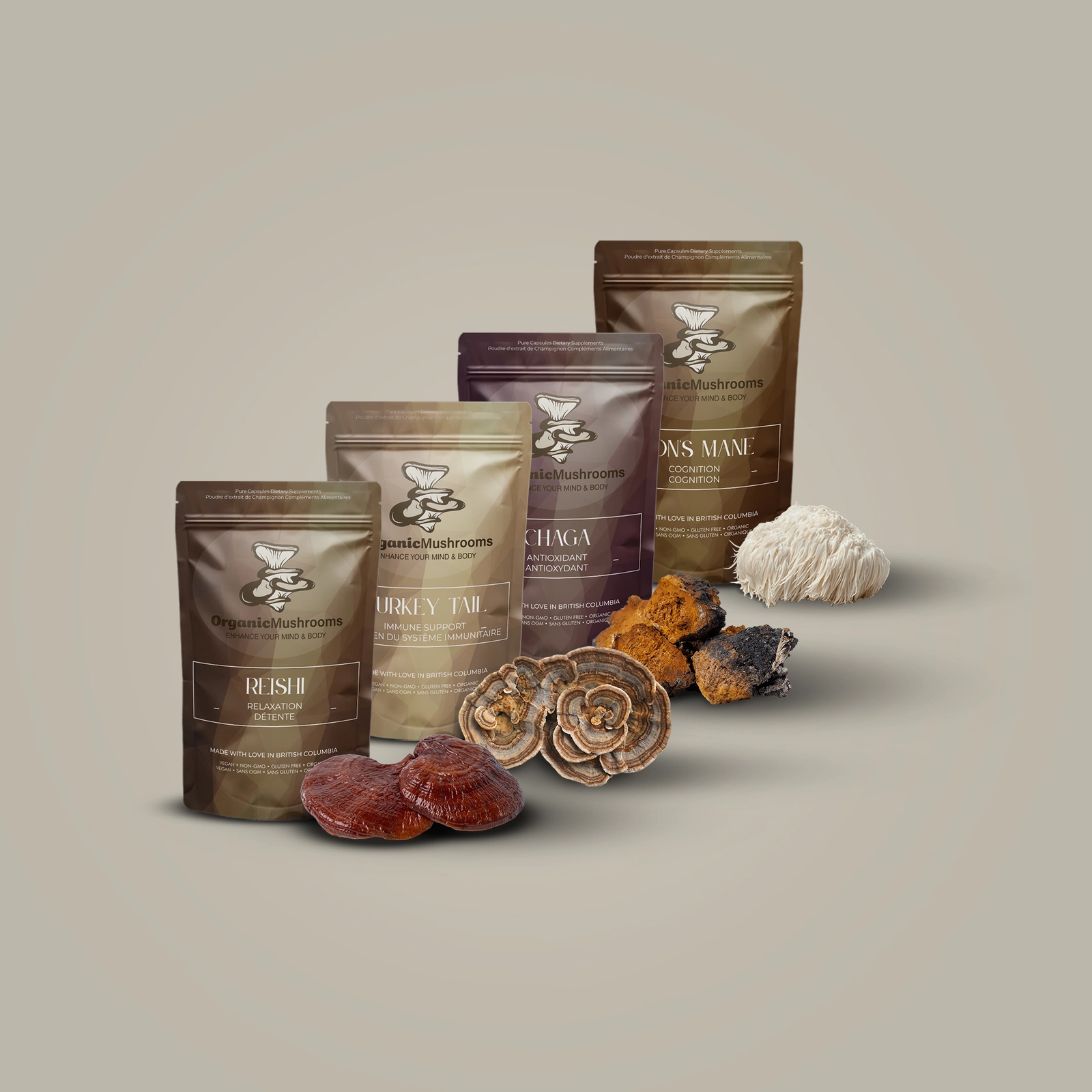 For best results, the recommended daily dosage is 2 capsules of each Turkey Tail and Chaga, and 1 capsule of each Lion’s Mane and Reishi.