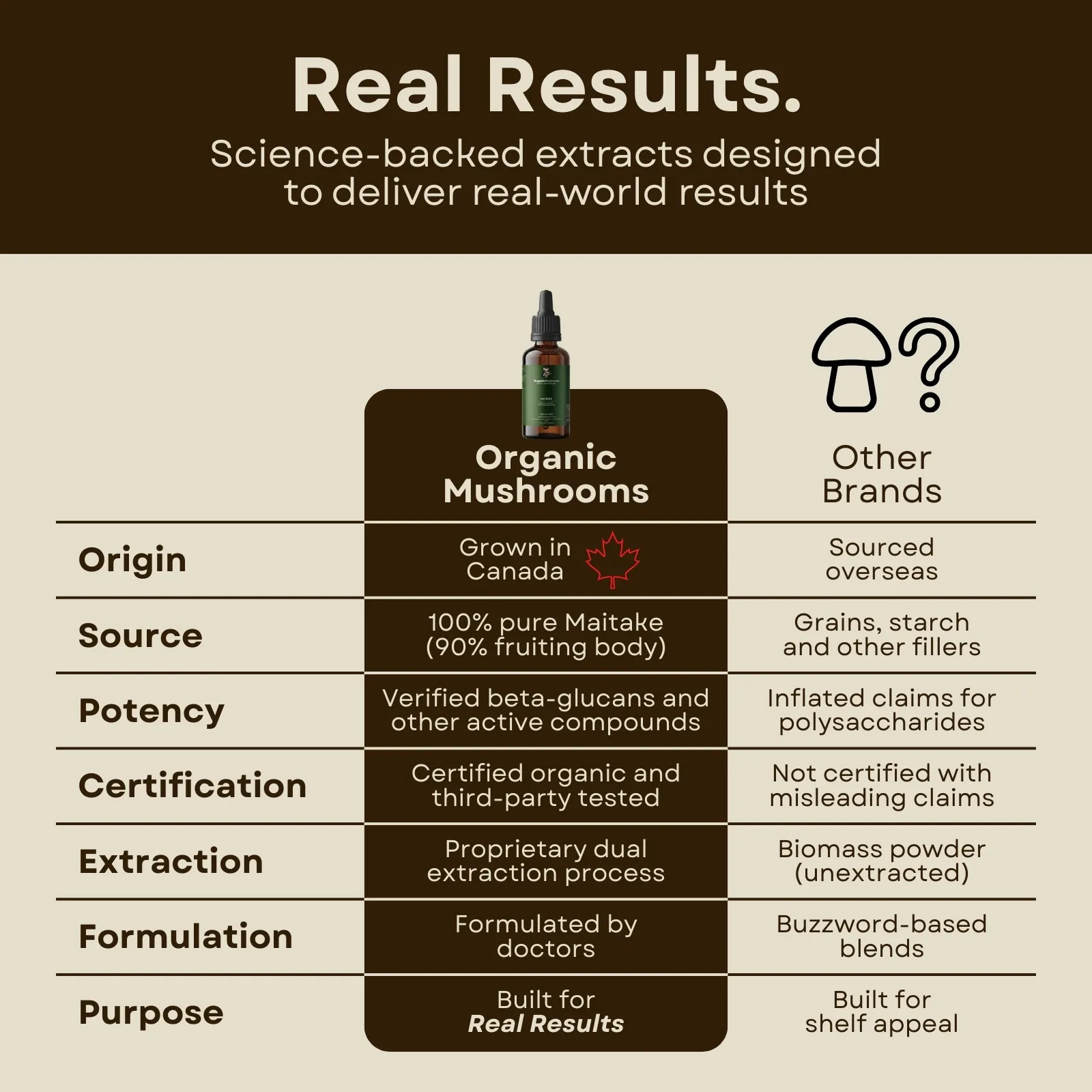 Our mushroom supplements are made (and grown) in Canada with organic mushrooms and no added fillers. Each batch is carefully extracted and third-party tested to guarantee the presence of the most beneficial compounds like beta-glucans and improve bioavailability.Â