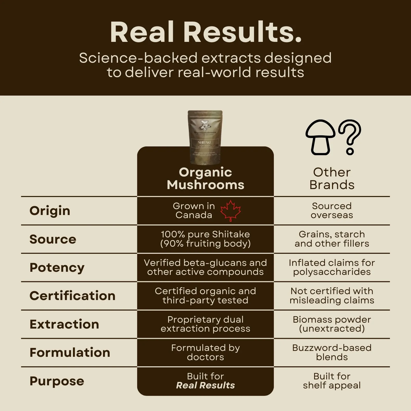 Our mushroom supplements are made (and grown) in Canada with organic mushrooms and no added fillers. Each batch is carefully extracted and third-party tested to guarantee the presence of the most beneficial compounds like beta-glucans and improve bioavailability.Â