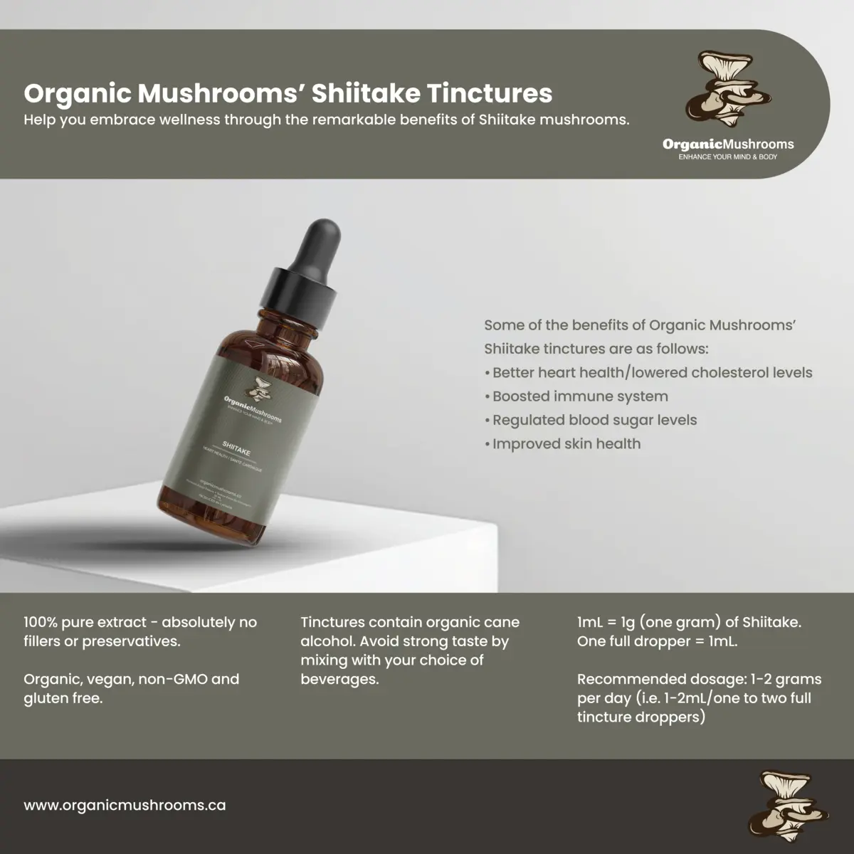 Incorporating Shiitake Tinctures into your wellness routine is easy—simply add the recommended dose to your preferred beverage and enjoy the nourishing benefits of Shiitake mushrooms.