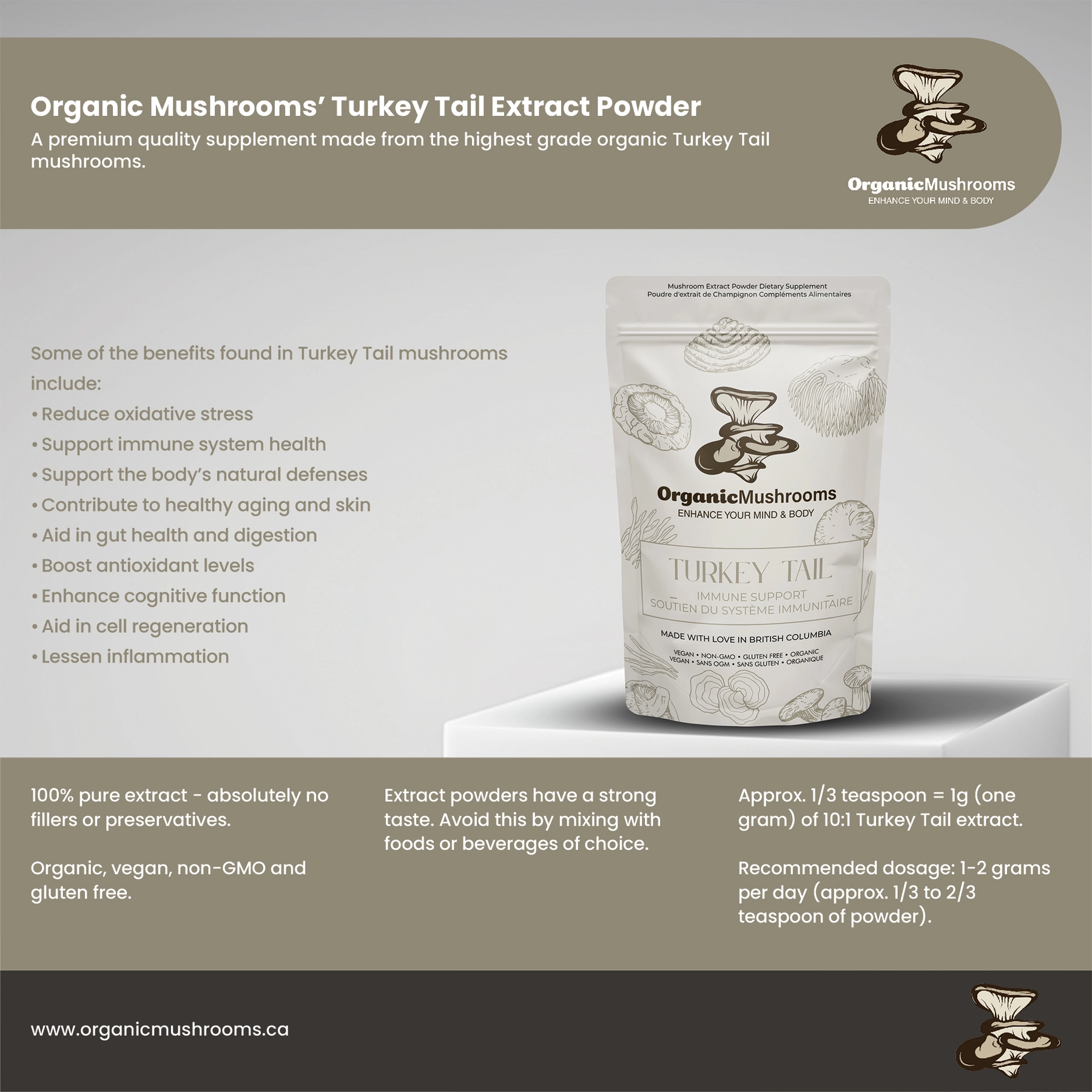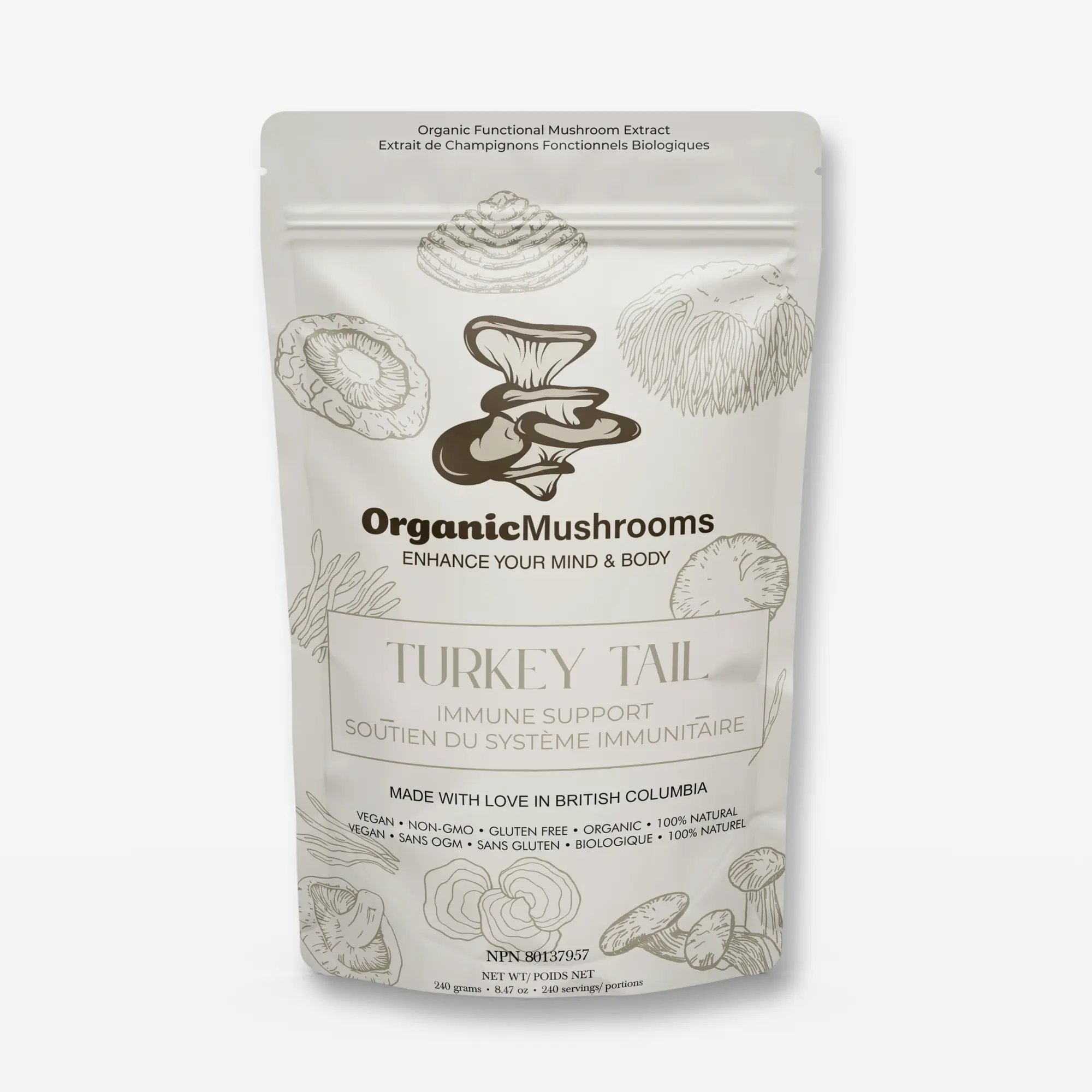 Our Turkey Tail Powder is a premium supplement crafted from Canadian-grown, organic Turkey Tail mushrooms. Known for their rich content of polysaccharides and beta-glucans, Turkey Tail mushrooms are naturally packed with nutrients that can help support your immune system and enhance your overall wellness.