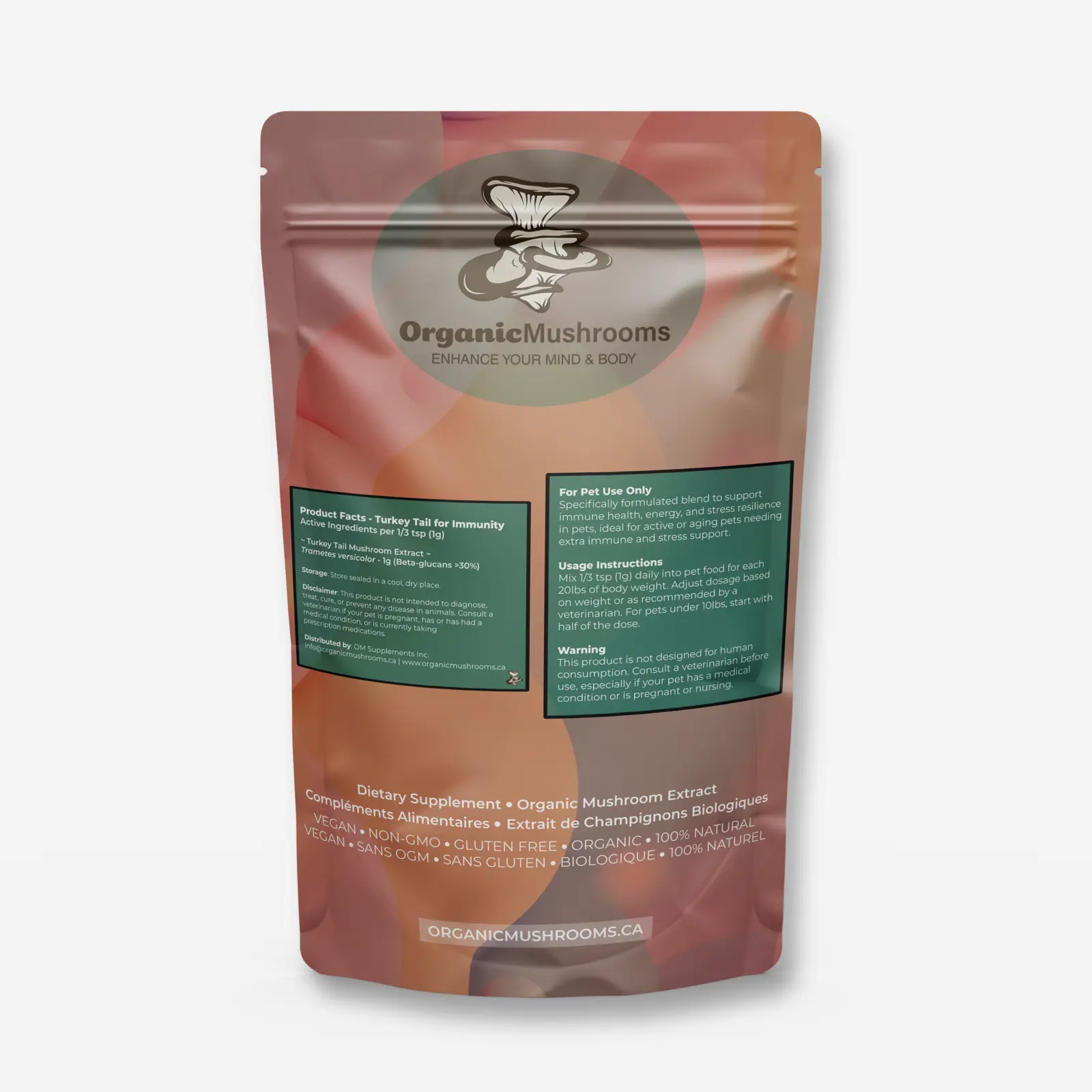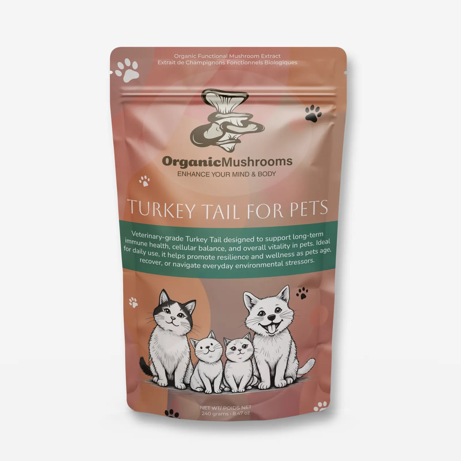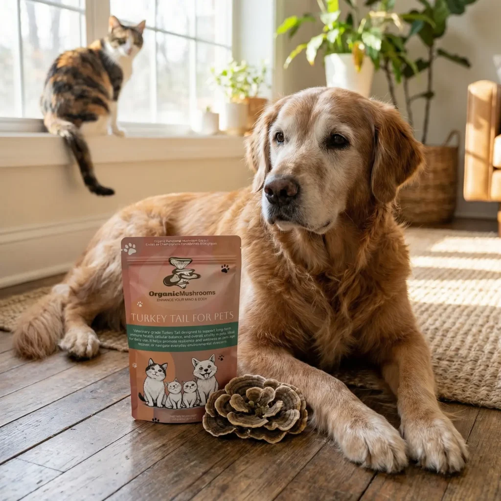 Turkey Tail for Pets is a 100% organic Turkey Tail mushroom extract powder formulated to support the natural defenses, resilience, and overall wellness of dogs and cats. Extremely rich in beta-glucans, this single-ingredient supplement is ideal for pets who benefit from added immune and cellular support, especially during periods of stress, aging, or recovery.